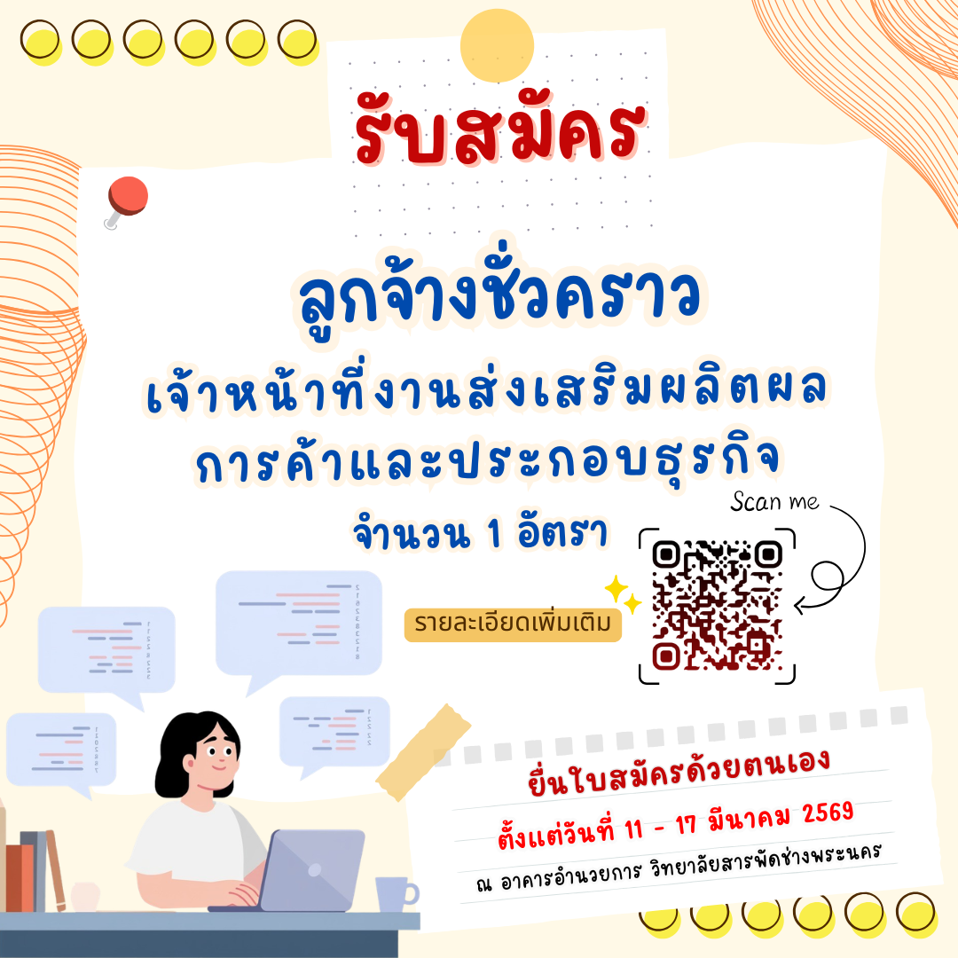 - ประกาศรับสมัครลูกจ้างชั่วคราว (โครงการจัดหาบุคลากรสนับสนุนเพื่อคืนครูให้นักเรียน) ตำแหน่ง เจ้าหน้าที่งานส่งเสริมผลิตผลการค้าและประกอบธุรกิจ (4 มีนาคม 2569)