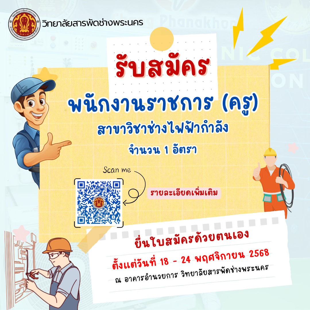 - ประกาศรับสมัครบุคคลเพื่อเลือกสรรและจัดจ้างเป็นพนักงานราชการทั่วไป (ครู) สาขาช่างไฟฟ้า (11 พฤศจิกายน 2568)