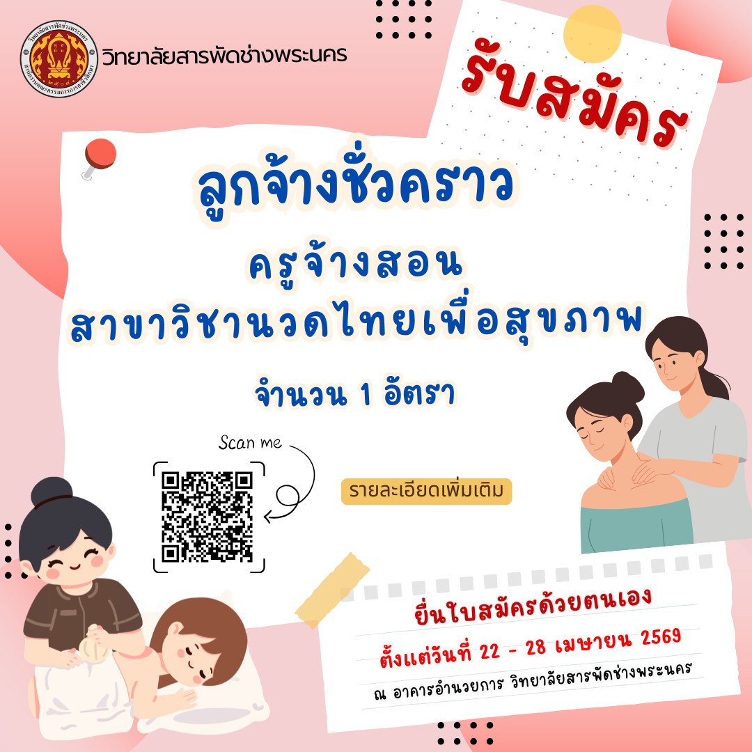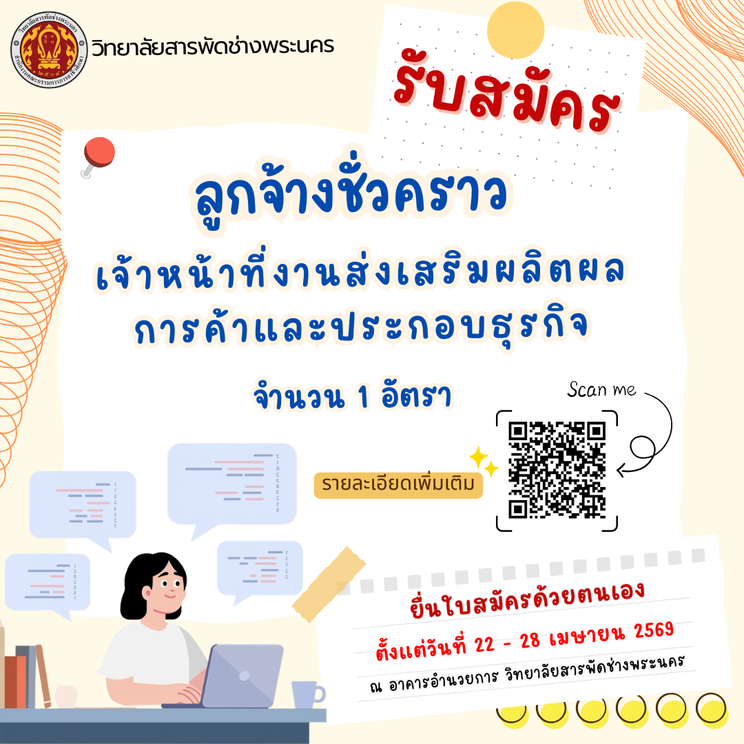 - ประกาศรับสมัครลูกจ้างชั่วคราว (โครงการจัดหาบุคลากรสนับสนุนเพื่อคืนครูให้นักเรียน) ตำแหน่ง เจ้าหน้าที่งานส่งเสริมผลิตผลการค้าและประกอบธุรกิจ (10 เมษายน 2569)